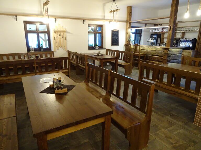 - Hosté si mohou sami natočit pivo či Kofolu, udělat kávu či čaj. Samoobslužný výčep je vybaven mincovním automatem (držíme zásobu mincí na výměnu za bankovky). Společenská místnost má maximální kapacitu 42 hostů, a disponuje: